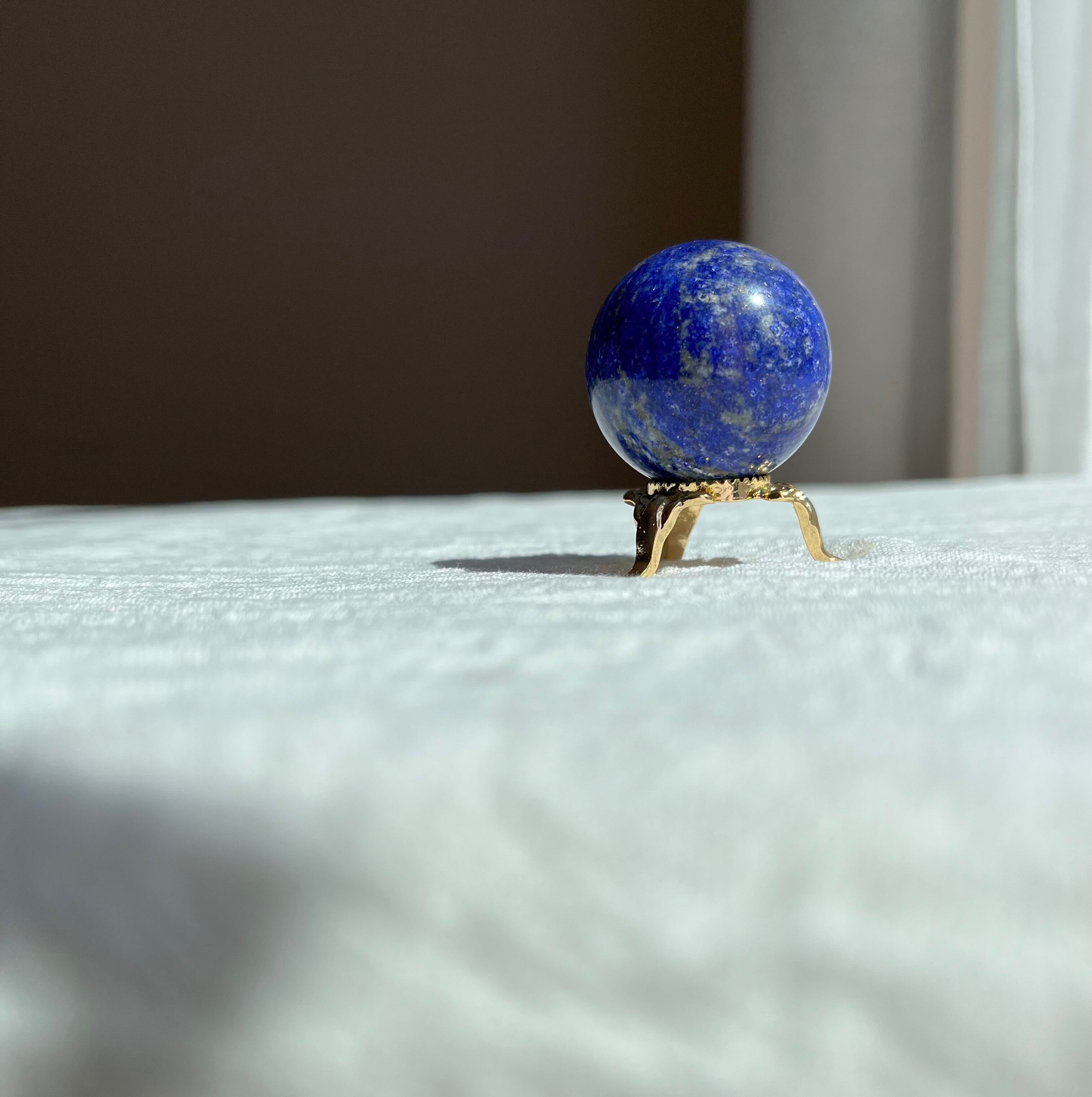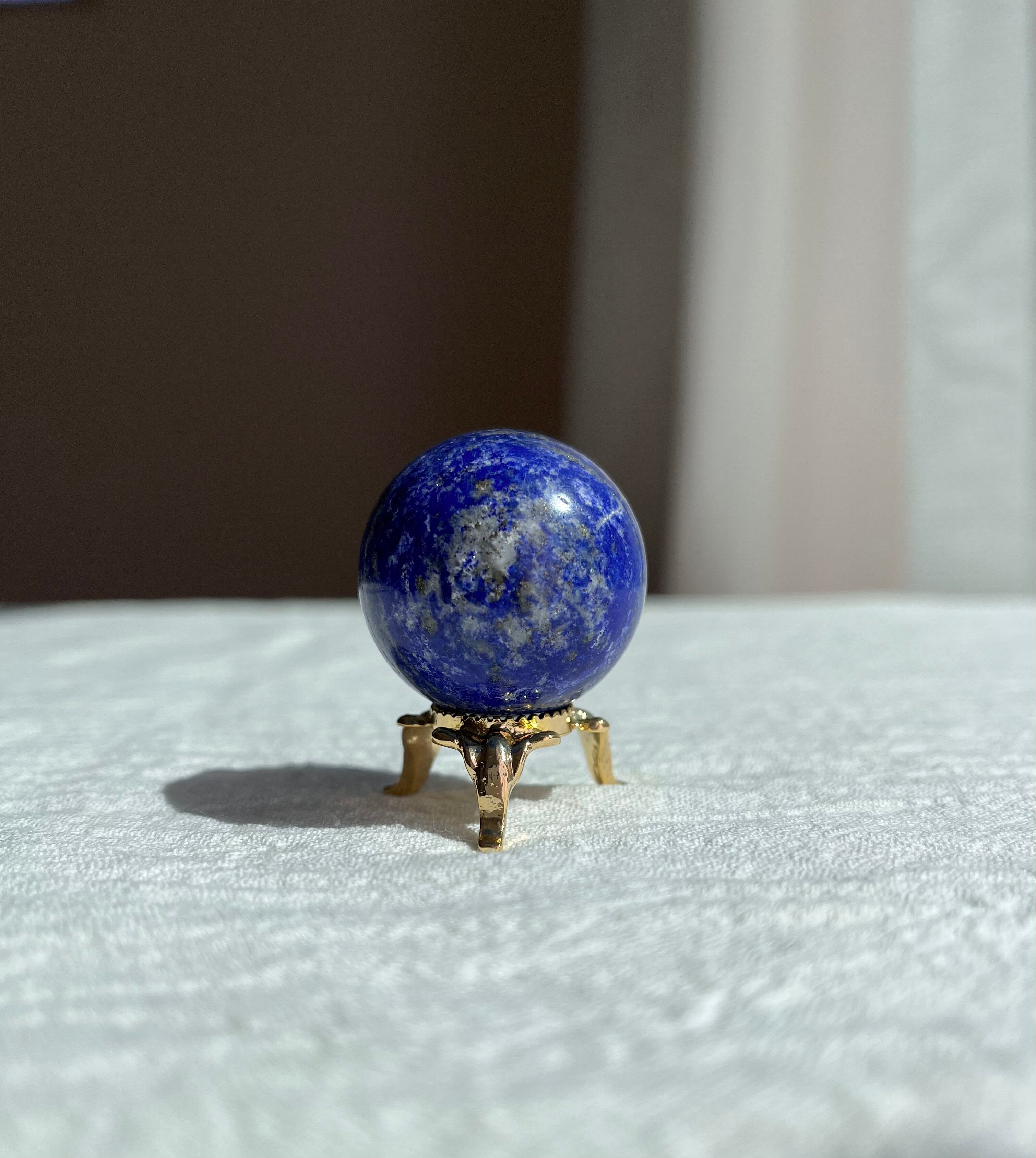 ラピスラズリのスフィアは、深い青色に金色のパイライト、白いカルサイトが混ざる美しい球体のクリスタルです。