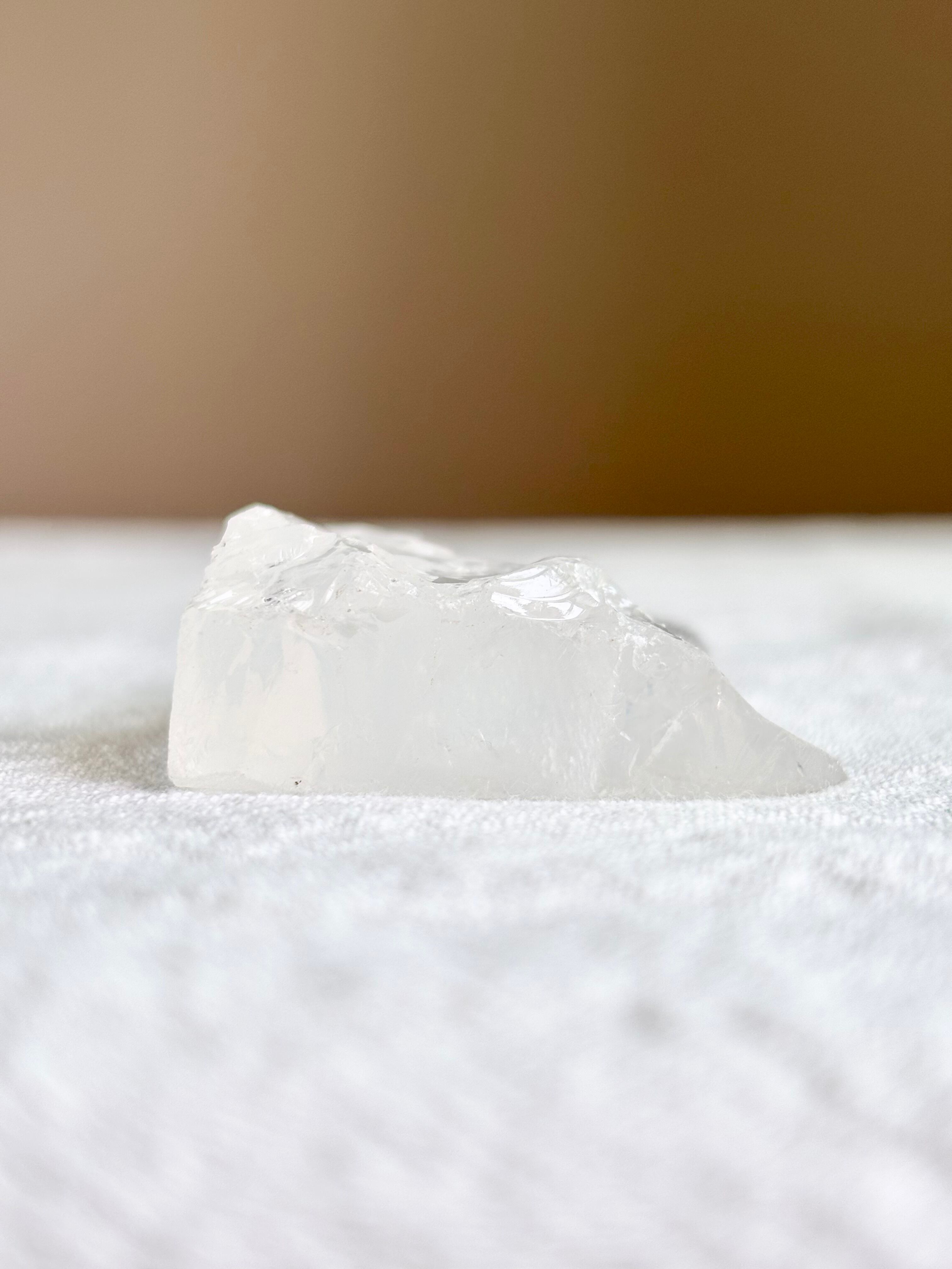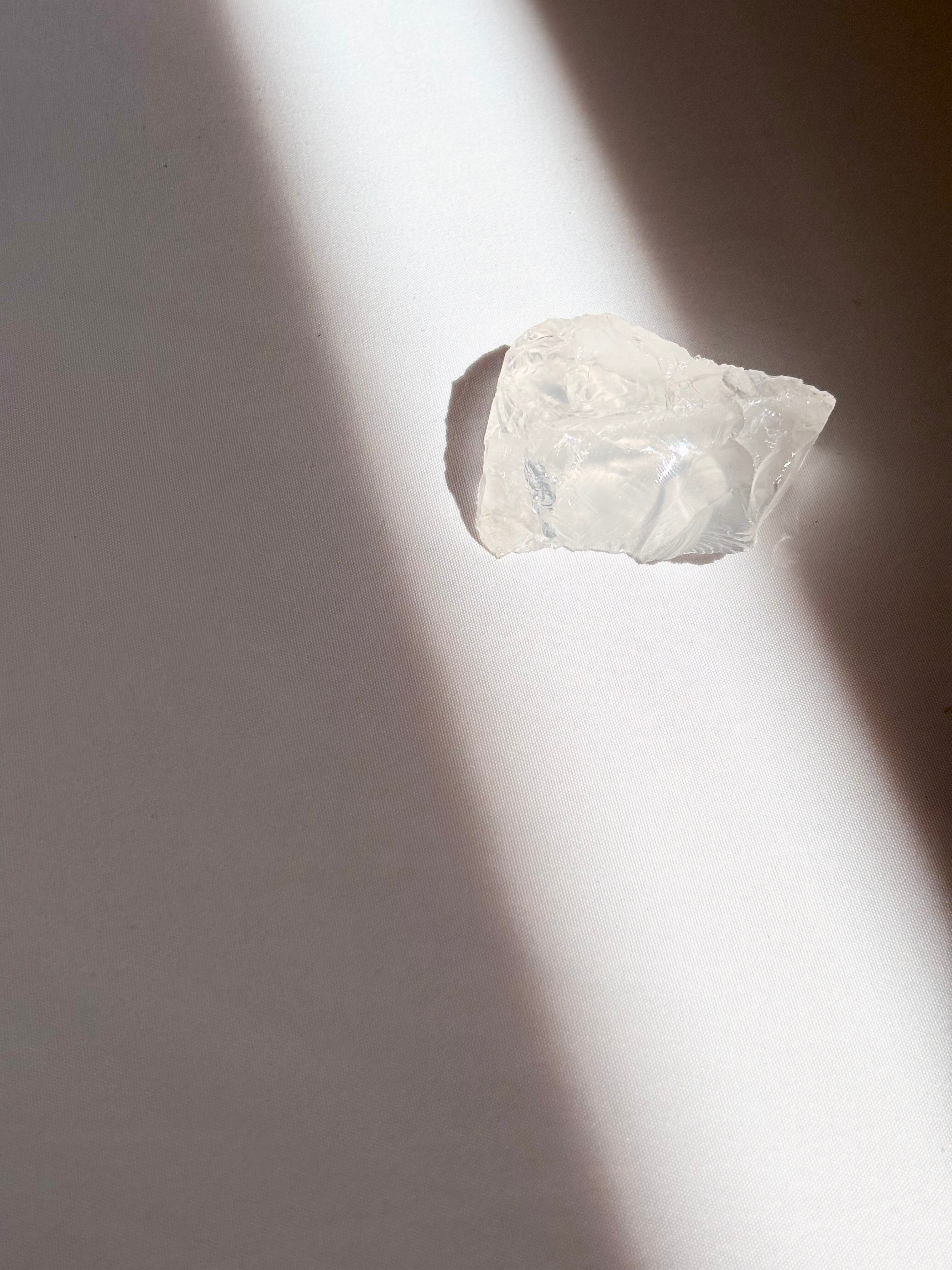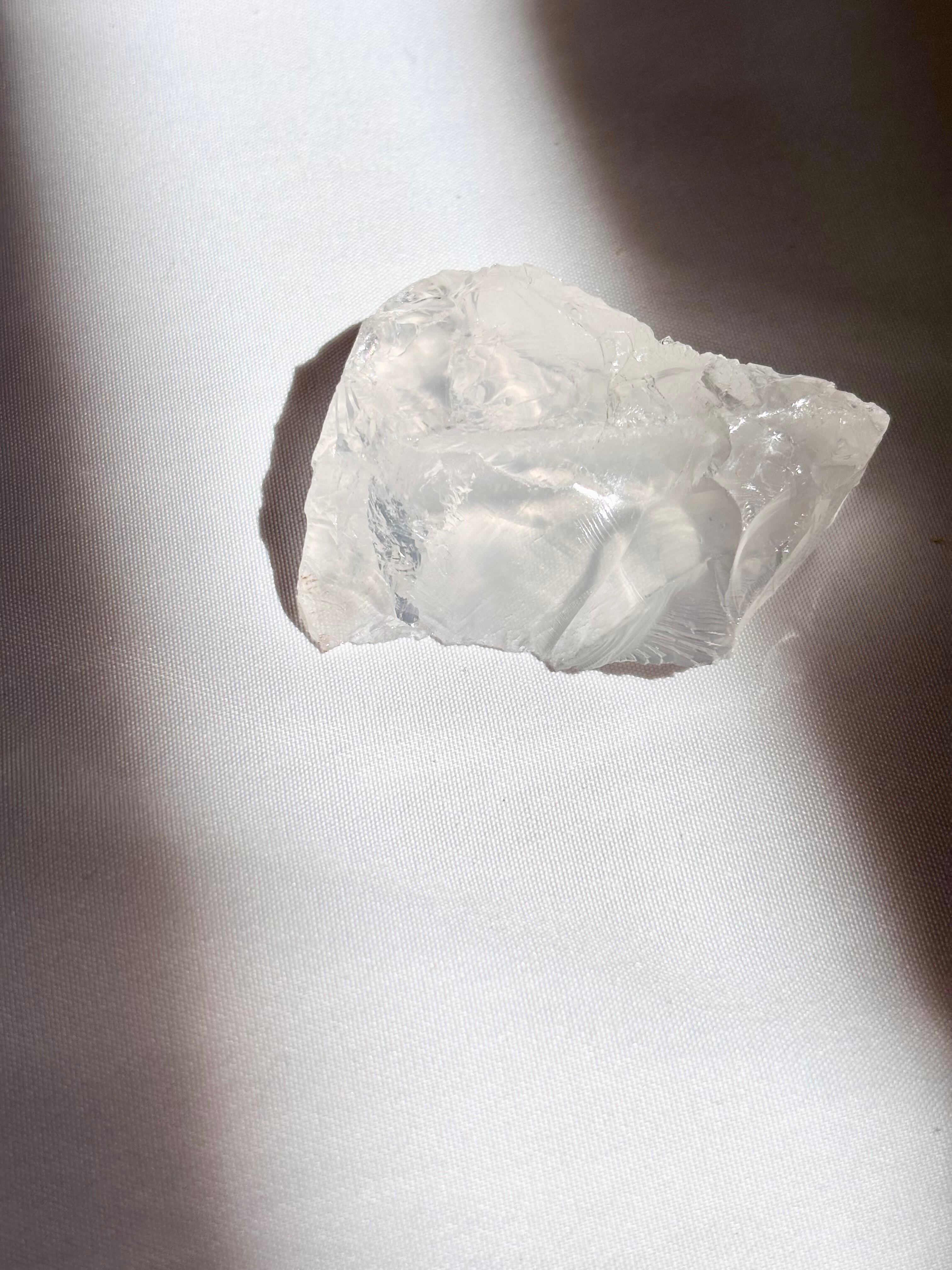 透明〜乳白色のガラスのような外見をしていますが、実際には天然石であり、その不思議な見た目から“クォーツの一種”と考えられています。