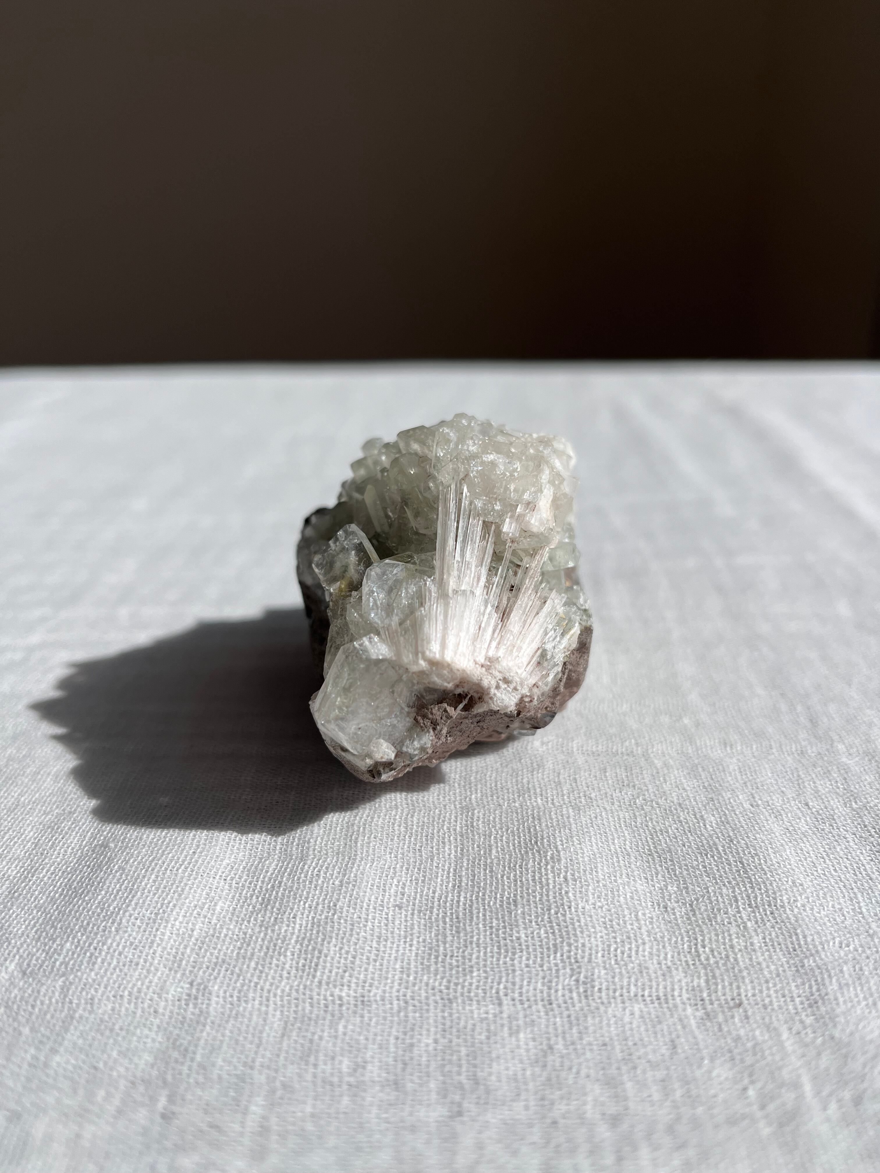 アポフィライトは透明感のある無色や白色や緑色の結晶、スコレサイトは白色の針状の結晶です。